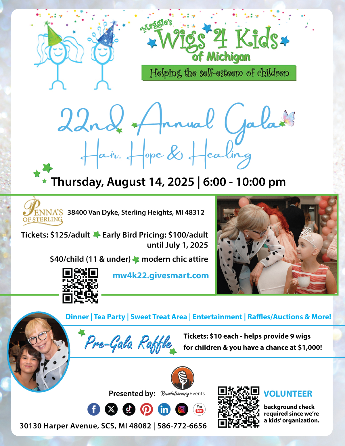 Maggie’s Wigs 4 Kids of Michigan is excited to announce our 22nd Annual Gala “22 Years of Hair, Hope & Healing” will be held on Thursday, August 14, 2025 – 6:00 pm at Penna’s of Sterling. This is our signature event of the year in celebration of the strength & courage of the wig recipients and families we serve.