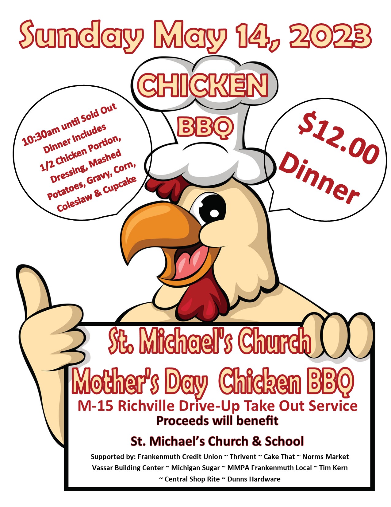 St. Michael’s Lutheran Church Richville, MI. Mother’s Day BBQ, 12.00 per dinner. Serving at 10:30 AM, til gone. Includes, chicken, mashed potatoes, dressing, corn, coleslaw & cupcake. Drive through only.