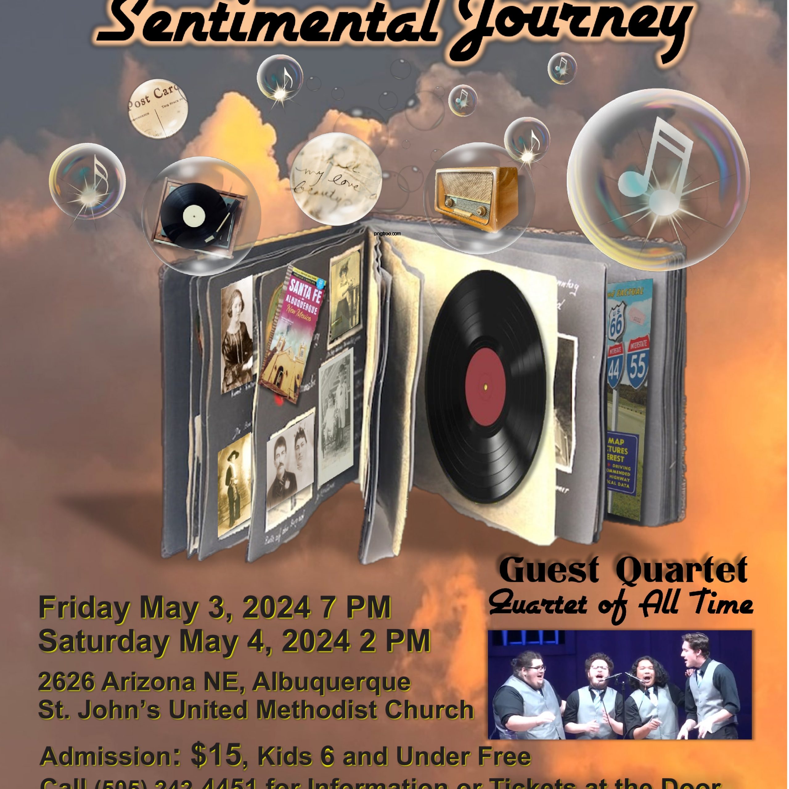 The Good ol’ Days Are Back!! Everyone enjoys great music and you won’t be disappointed! The New MexiChords barbershop chorus and quartets will bring back the good ol’ days in this year’s Spring show, “Sentimental Journey” . Take a trip back to when music was mellow, when you could understand the lyrics, and they brought tears to your eyes with the memories of your youth. The very best that four-part a cappella singing in the barbershop style can bring is what the New MexiChords are all about. Our chorus brings to its audiences a level of musical entertainment that is hard to beat. Joining the chorus will be our guests, Quartet of All Time, a youthful four-some who will entertain our audiences with wonderful barbershop harmonies that will set your toes a-tapping!