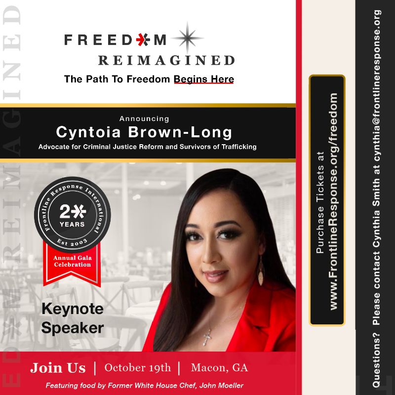 Out of Darkness Middle Georgia, the anti-sex trafficking department of Frontline Response, is to hold its annual Gala to raise funds that help not only reach but also rescue the women of Middle Georgia who are experiencing the modern day slavery of sex trafficking in our area, giving them a path towards FREEDOM! Speakers will include advocate for criminal justice reform Cyntoia Brown-Long and Christopher Payne, both victims of human trafficking. Chef John Moeller, a long-term White House chef and author, will prepare a State Dinner; and the “Voices of Lee” a cappella group from Lee University in Tennessee will bring their musicianship to the stage. Charity Auctioneer Jim Miller is to conduct both a Live Auction as well as a Silent Auction. Come help us celebrate our 20th year of being on the Frontlines with “Freedom Reimagined”!