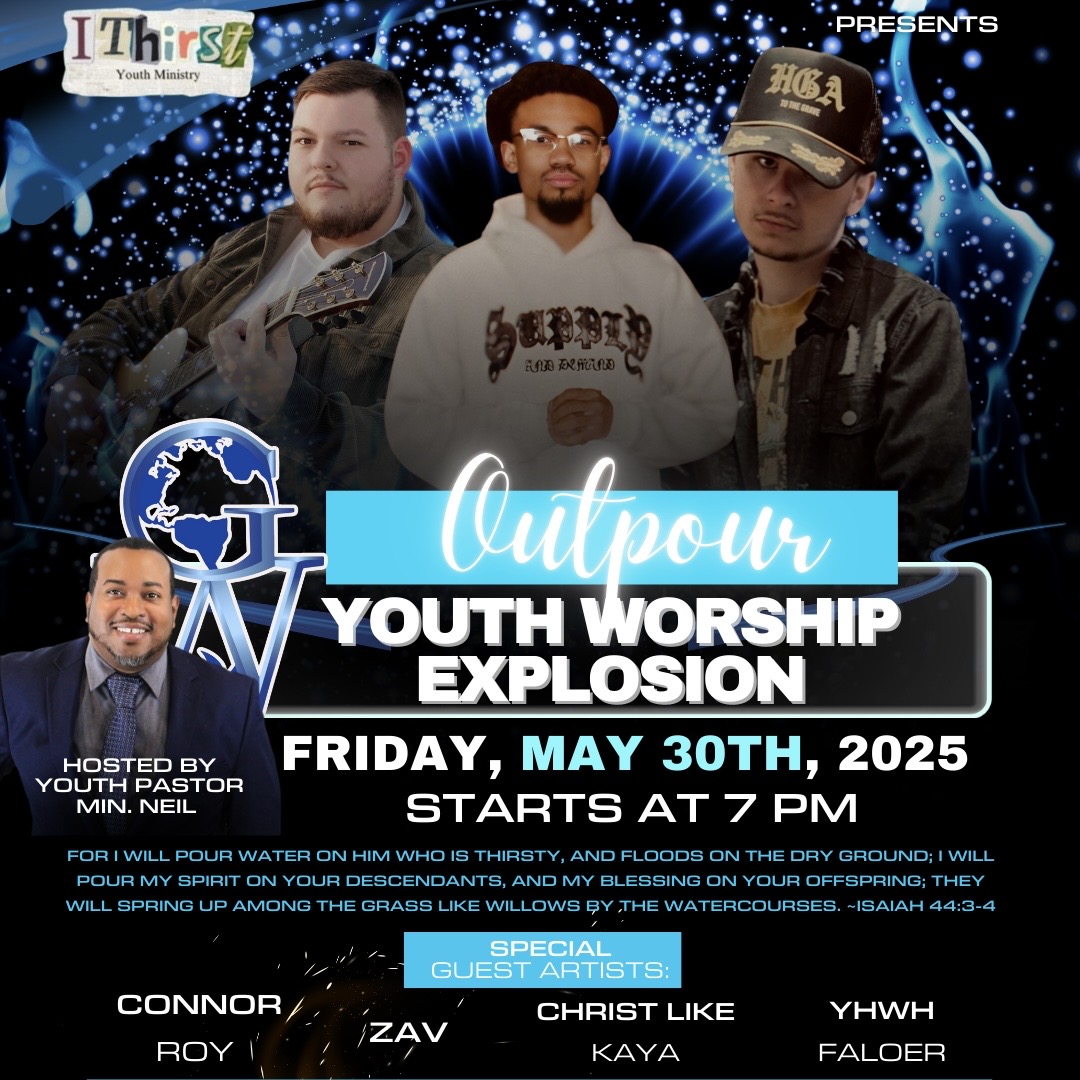 I Thirst Youth Ministry invites you to join us at Greater Works Detroit for an night of powerful worship featuring award-winning Singer-Songwriter and Worship Leader, CONNOR ROY! Special Guest Artists include ZAV, CHRIST LIKE KAYA, and YHWH FALOER, three up-and-coming Christian Rap/Hip-Hop artists!