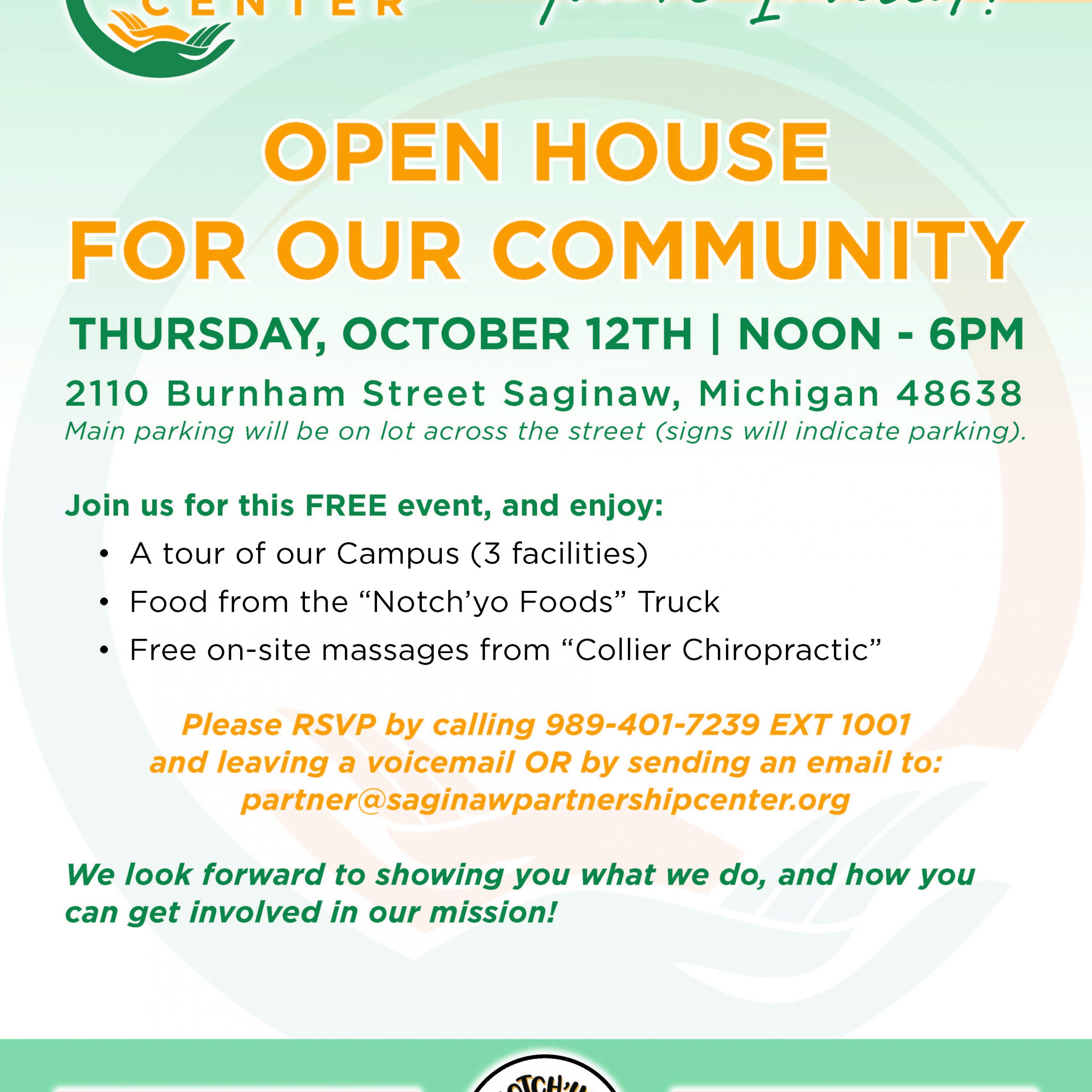 • There will be an informative walk-through tour of our extended campus (3 facilities) so individuals can learn about what we do, our growing impact, and how to partner with us. Food Truck will be on-site from “Notch’yo Foods” and “Collier Chiropractic” will be on-site providing FREE massages. If possible, please RSVP by calling 989-401-7239 EXT 1001 and leaving a voicemail OR email at: partner@saginawpartnershipcenter.org