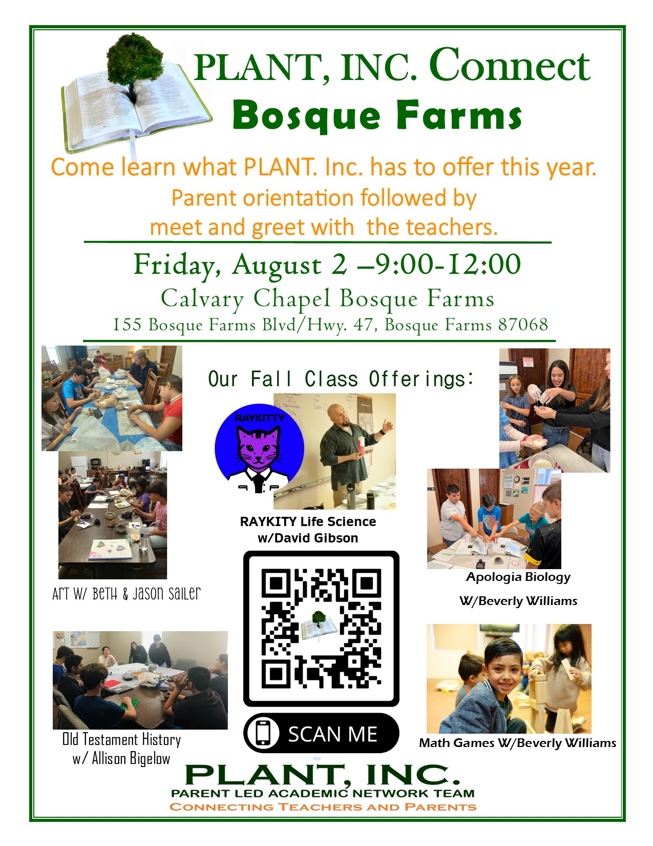Parent Information Meeting and Open House to learn more about Parent Led Academic Network Team, Inc. (PLANT, Inc.) a network of parents, teachers, and administrators coming together to create places of learning for students aged 3-19. Come see what is available in Bosque Farms in the Fall and meet the teachers.