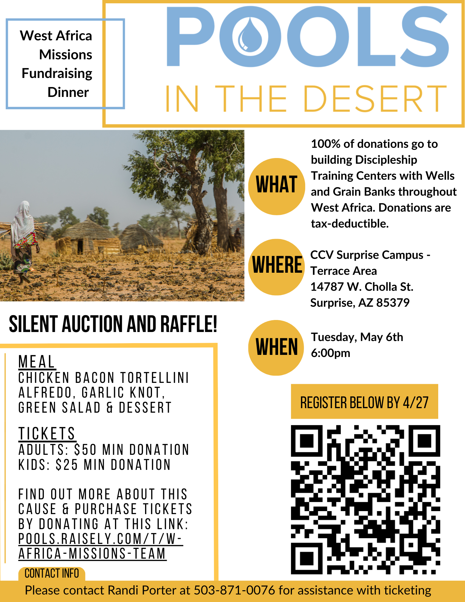 Come out and participate in a fundraiser dinner on May 6th at the CCV Surprise Campus where funds are being raised for an initiative called Pools in the Desert, which supports an extremely unreached nation in West Africa through a missions organization called Team Expansion. Ministry in this location in Africa can be dangerous – especially for outsiders. God has used Team Expansion to raise up over 5,000 local believers with a passion for making disciples. These new believers are eager to be trained and sent out.