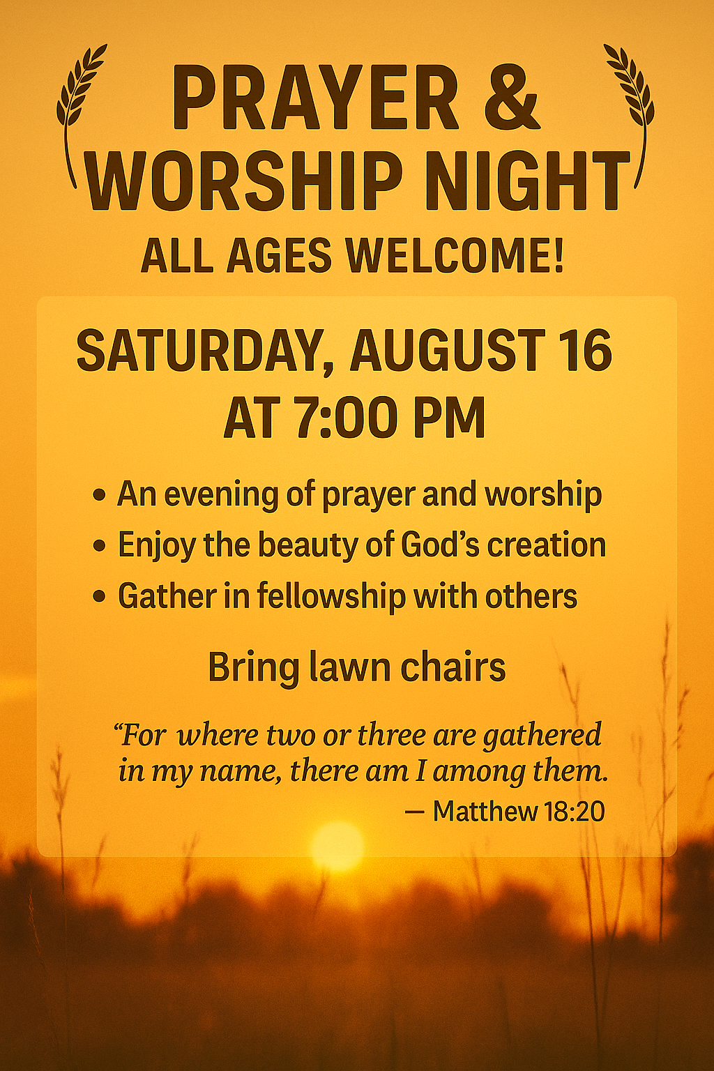 A night or prayer and worship on the lawn is a new even going on in northeast Kansas. The first even was held Saturday August 2nd. It was so moving and inspiring we have decided to make it a biweekly event. The next one is coming up August 16th. Come join us to lift up everyone in prayer and lift praises to the most high God as we worship together!