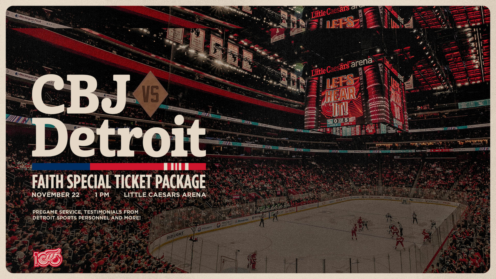 Join us for Faith & Family Game at Little Caesars Arena for a day of fun, fellowship, friendship and cheering on the Red Wings! Enjoy pregame service, testimonials, and more before enjoying the game against the Columbus Blue Jackets on November 22. We look forward to seeing you and your congregation members at the game.