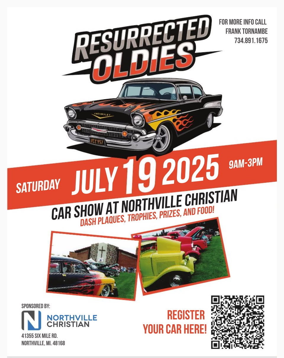 Northville Christian is sponsoring a Car Show that includes a live band, giveaway prizes, and food. A fun time for all!