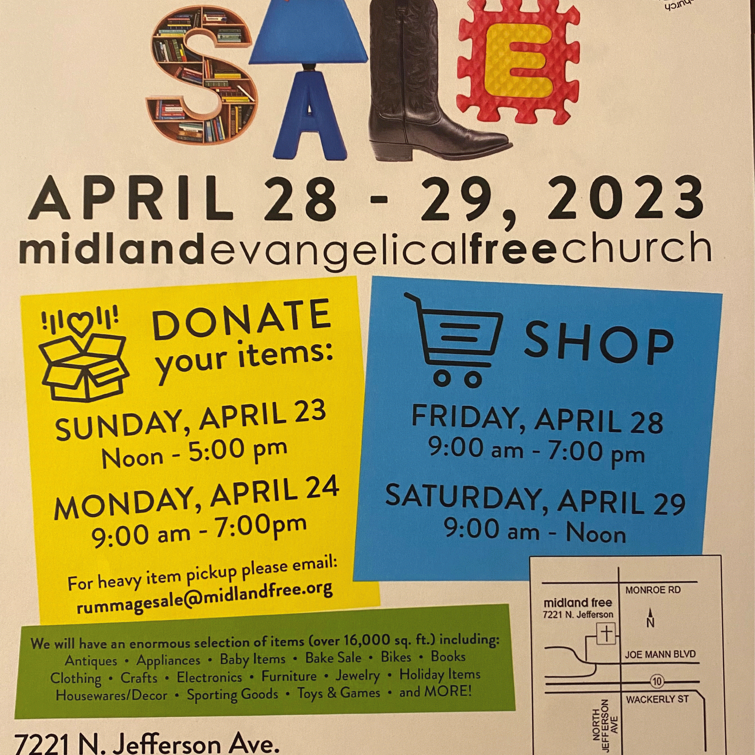 Annual Rummage Sale: We will have an enourmous selection of items (over 16,000 sq. ft.) including: Antiques, Appliances, Baby Items, Bake Sale, Bikes, Books, Clothing, Crafts, Electronics, Furniture, Jewelry, Holiday Items, Housewares/Decor, Sporting Goods, Toys & Games, and MORE! Benefits youth missions…
