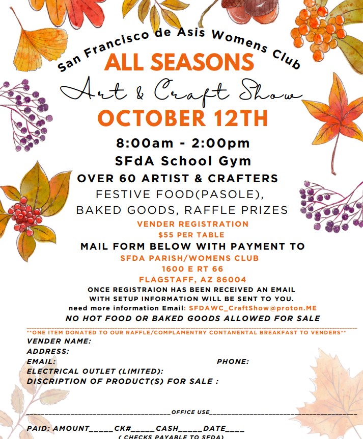 Make checks payable to SFdA Parish/Women’s Club ($55 per table) and mail to 1600 E RT 66, Flagstaff, AZ 86004