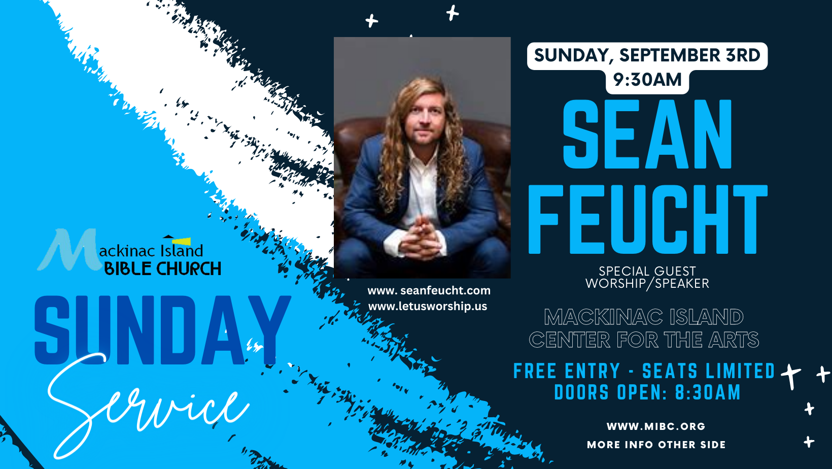 Join Mackinac Island Bible Church on beautiful and historic Mackinac Island for worship artist, prolific missionary, speaker and activist Sean Feucht for a special service at the Mission Point Resort Center for the Arts. You may have seen Sean Feucht all over the news, magazines and from his Documentary “Superspreader.”  This is a beautiful opportunity to come to this iconic, no-automobile island in the pristine waters of Lake Huron. There are no tickets necessary – except ferry tickets to Mackinac Island – so come early – the ferry fee keeps some from coming to events, but don’t let it stop you. Stay on the Mainland to save hotel costs. Seats are limited to 550. Doors open at 8:30am!