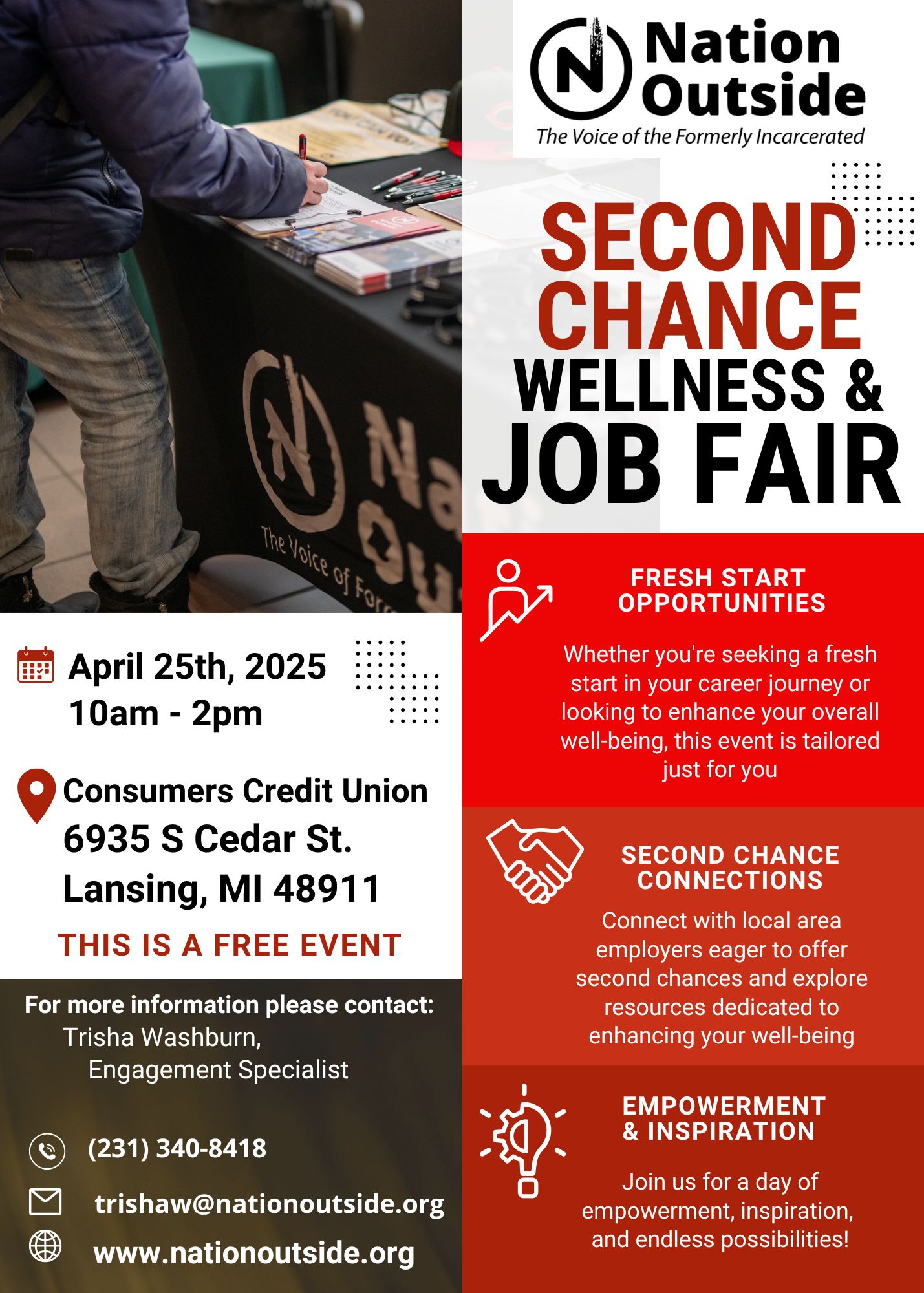 Please attend Nation Outside’s Second Chance Wellness and Job Fair where you can get connected to local businesses that are hiring as well as social service agencies that can help address any barriers to obtaining and maintaining employment.