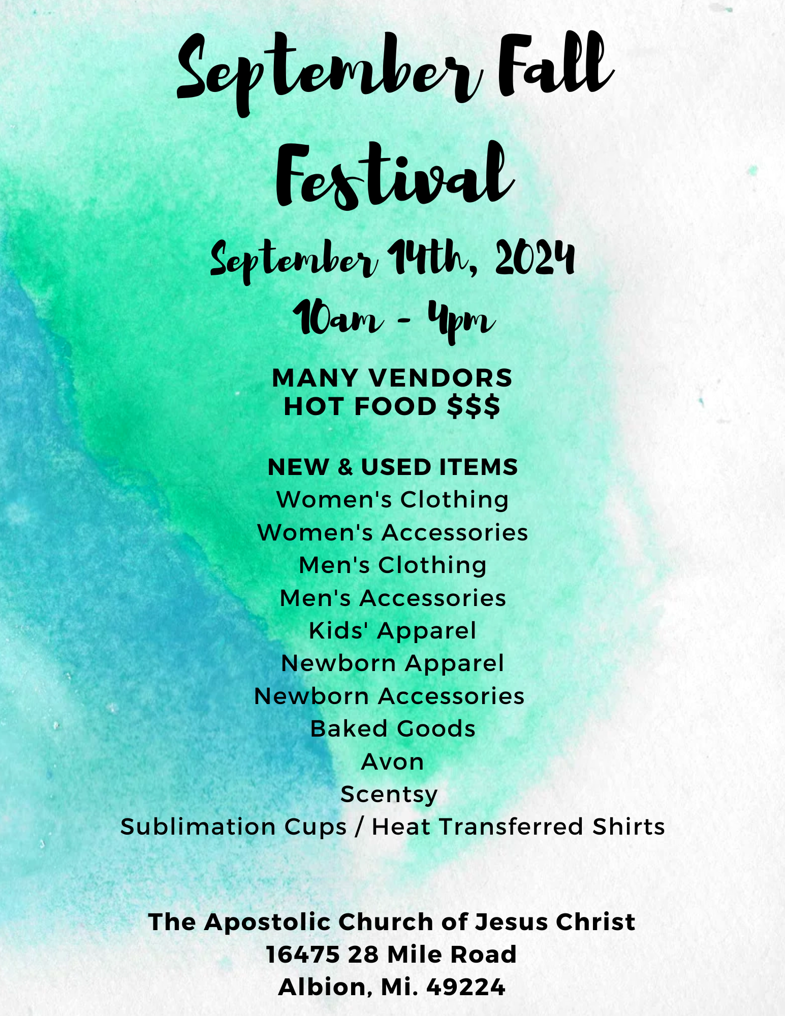 The Apostolic Church of Jesus Christ is having a huge sale with multiple vendors. There are new and used items, baked foods, clothing for all ages (women, men, kids, newborn), heat transferred items, sublimation cups, Avon, Scentsy products, etc. The church will have hot food for purchase.