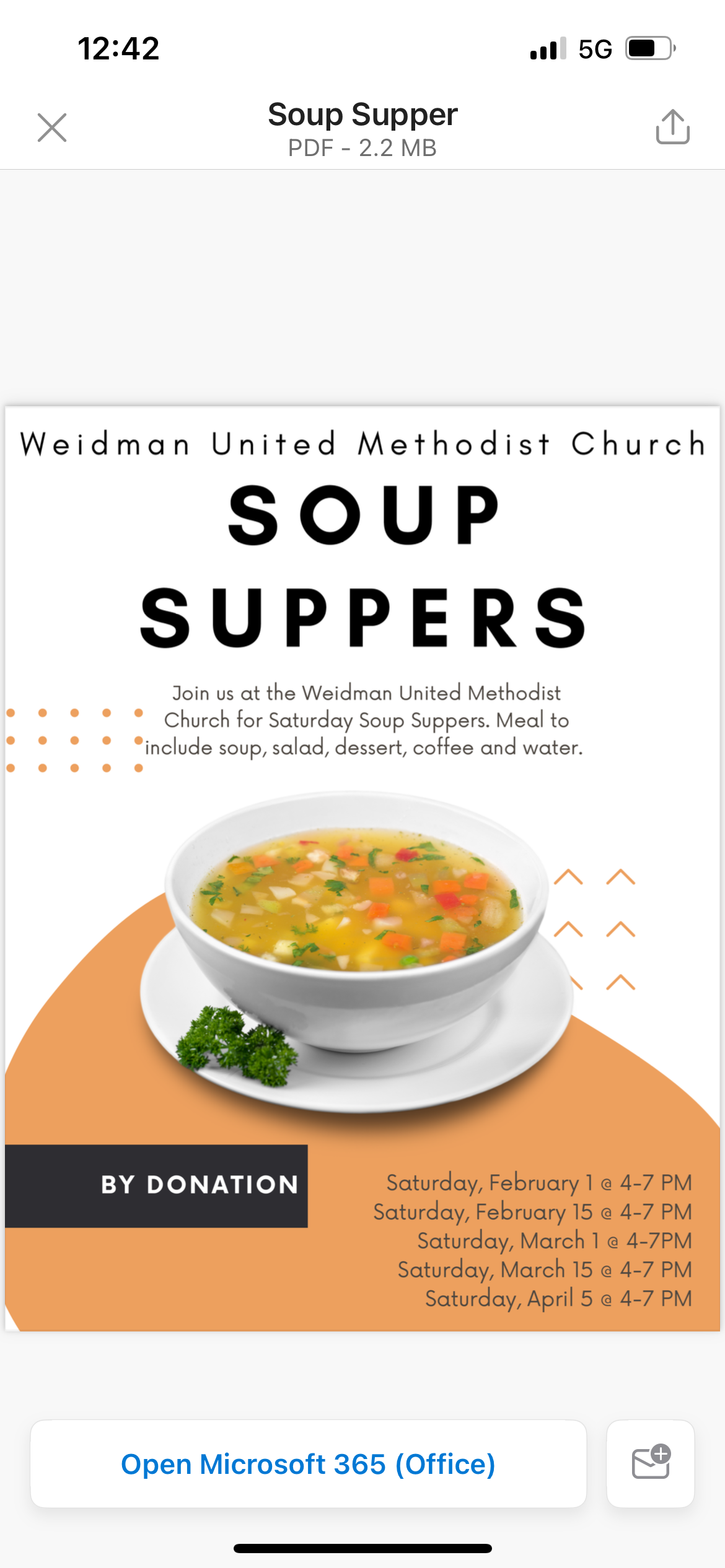 Join us at the Weidman United Methodist Church for Saturday Soup Suppers. Meal to include Soup, salad, dessert, coffee and water.