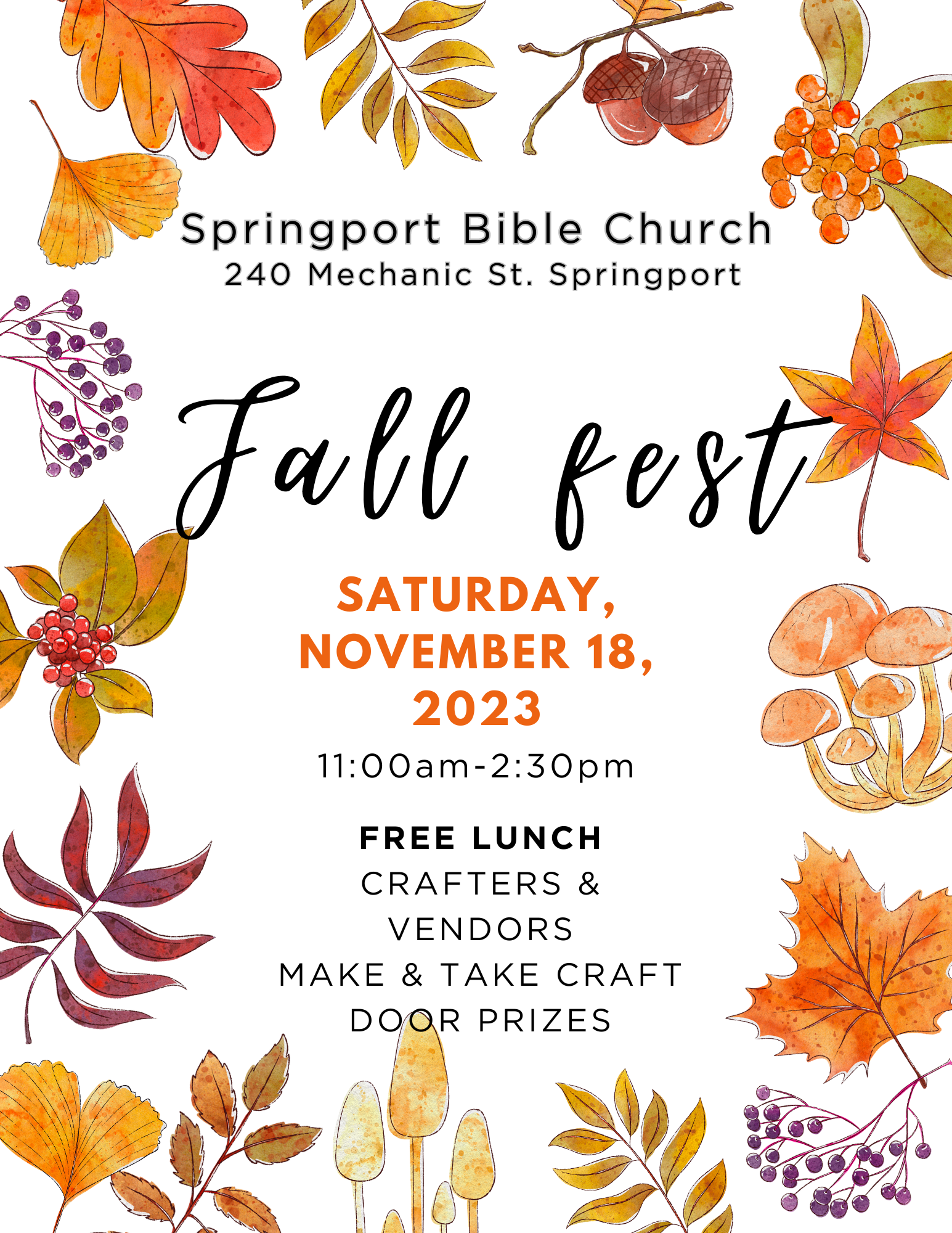 Come join us at Springport Bible Church, 240 Mechanic St, Springport, MI 49284, for our family friendly Fall Fest!!