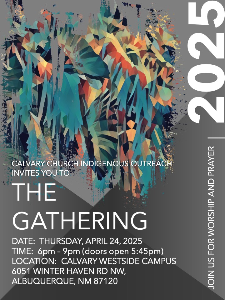 Join us for a special event hosted by Calvary Church Indigenous Outreach Ministry. We’re excited to present ‘The Gathering’ taking place on Thursday April 24, 2025 from 6p-9pm at Calvary Westside. A powerful time of worship, spiritual awakening and fellowship just before the Gathering of Nations Powwow in Albuquerque, NM.