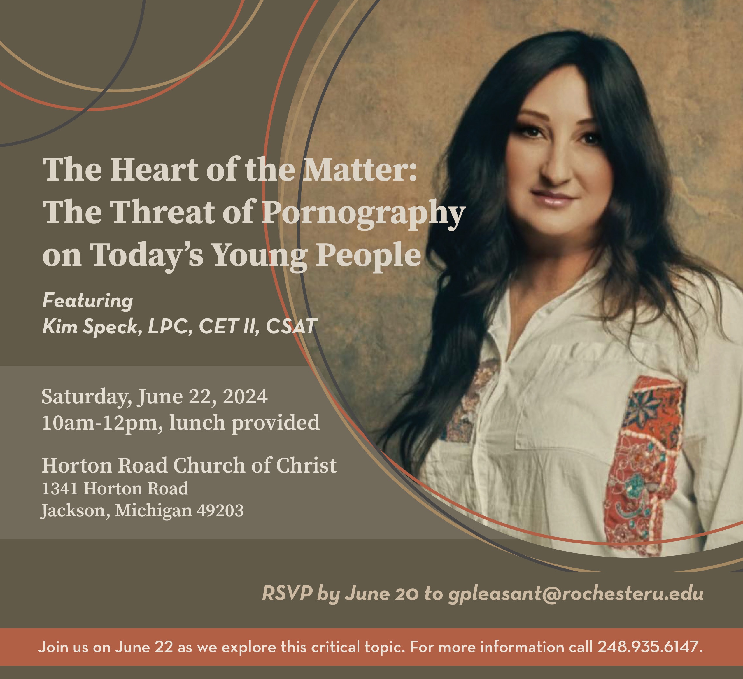 Lecture and discussion on the dangers, effects and impact of pornography on young people today. Presented by Kim Speck a licensed professional counselor, certified experiential therapist and certified sex addition therapist.
