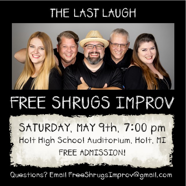 Please join us for one “Last Laugh” with Free Shrugs Improv. It’s happening Saturday, May 9, 2026 at Holt High School Auditorium. Doors open at 6:00 pm. Show starts at 7:00 pm. Admission is Free! Questions? Email freeshrugsimprov@gmail.com.