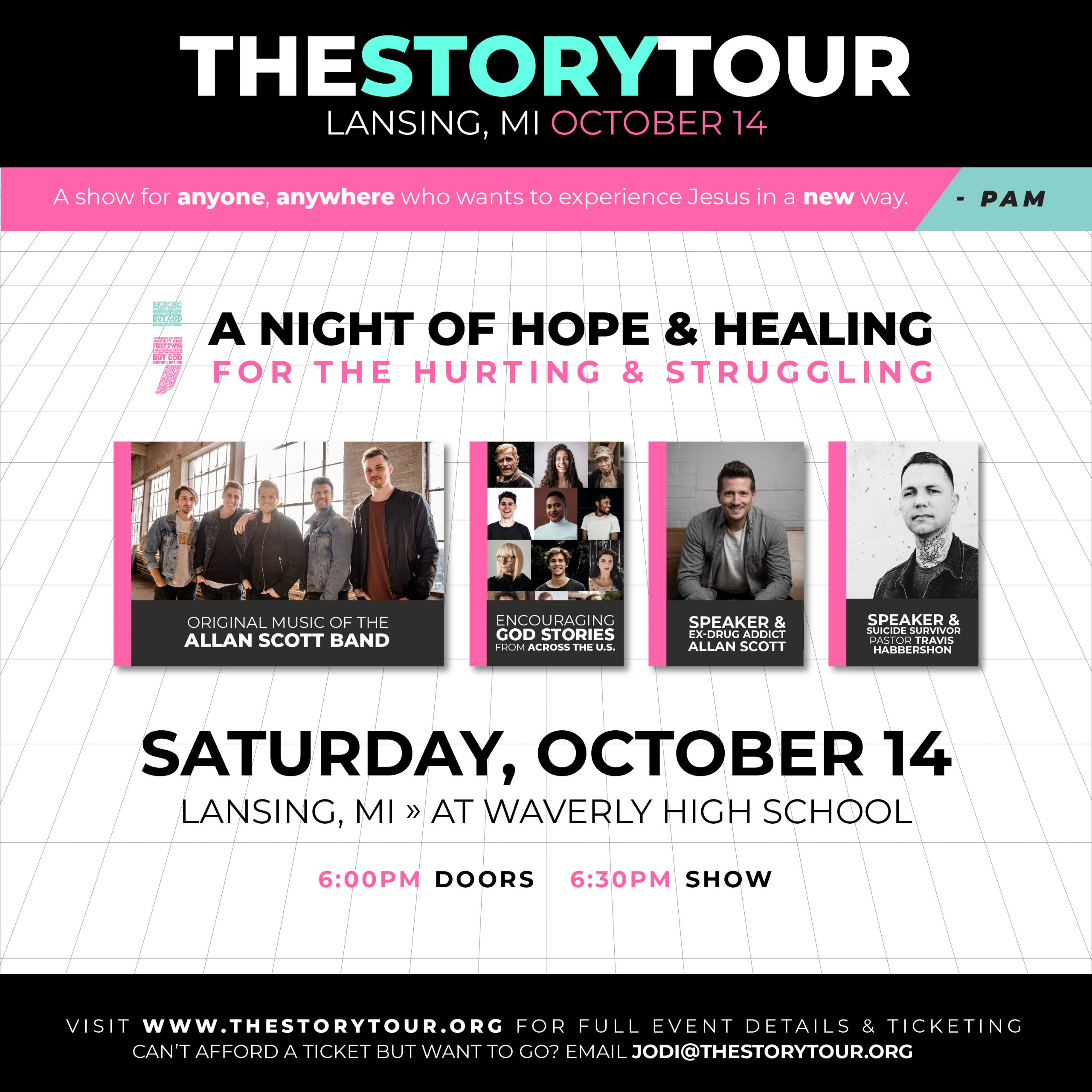 Found & Favored Ministries presents ‘The Story Tour’ at Waverly High School on Saturday, October 14, 2023. Join us for a one-night musical journey featuring the hope-filled music of Allan Scott Band, inspiring times of ministry with speakers Allan Scott and suicide survivor Pastor Travis Habbershon, powerful testimonies and stories of God’s redemption; all designed to communicate one truth: ‘with Jesus, your story isn’t over!’ It’s a powerful and unique experience for those who are hurting, addicted or struggling with their faith. To find more information and purchase tickets, visit www.thestorytour.org. We hope to see you there!