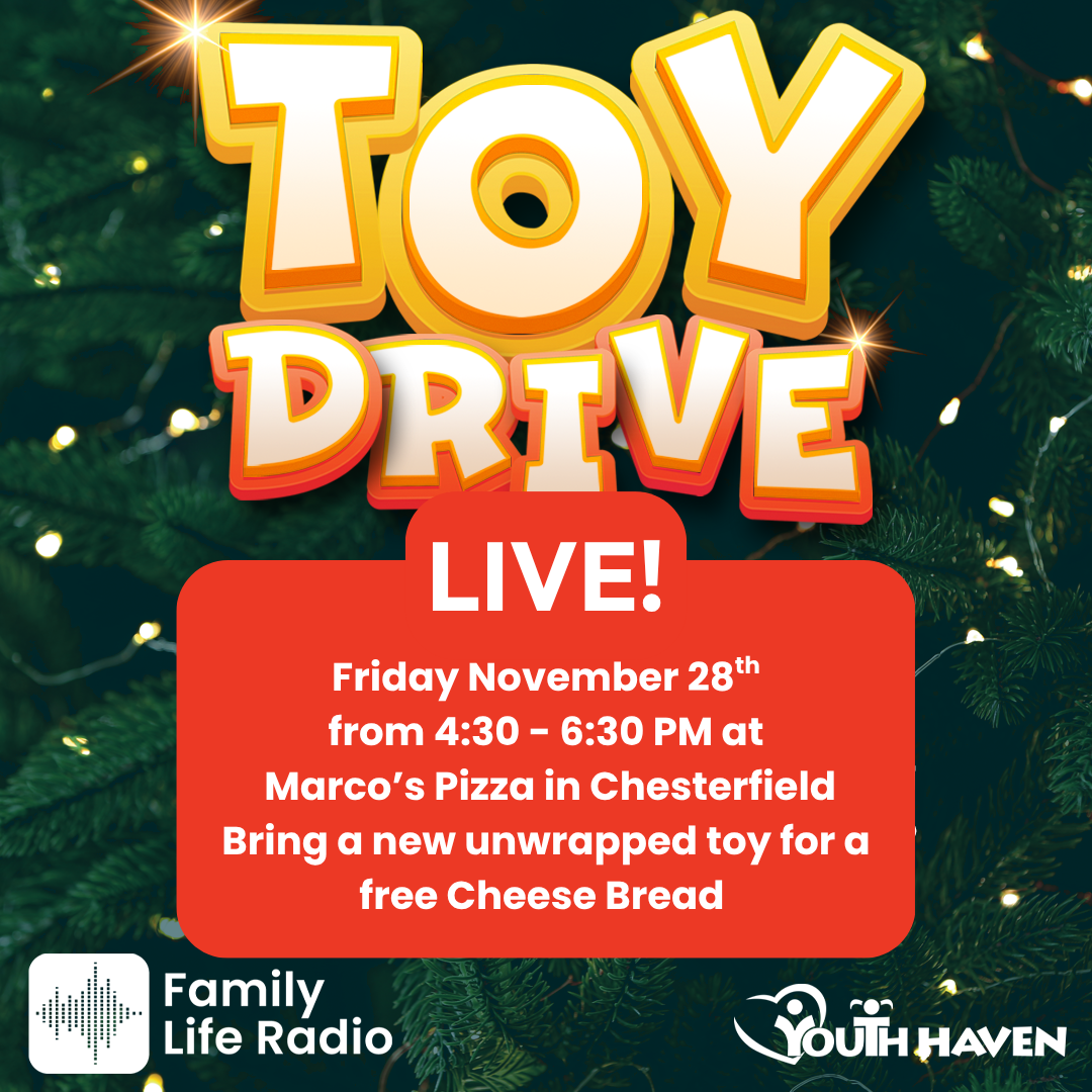 This year’s toy drive has begun and we want to give the kids at youth haven a Christmas they’ll never forget. Join Family Life Radio Friday November 28th from 4:30 to 6:30 pm for “Toy Drive Live” at Marco’s Pizza in Chesterfield, just south of 22 mile on Gratiot. We’ll have music, game and if you bring a new, unwrapped toy to donate, we’ll give you a free cheesy bread, just to say “thanks.” (One per customer)