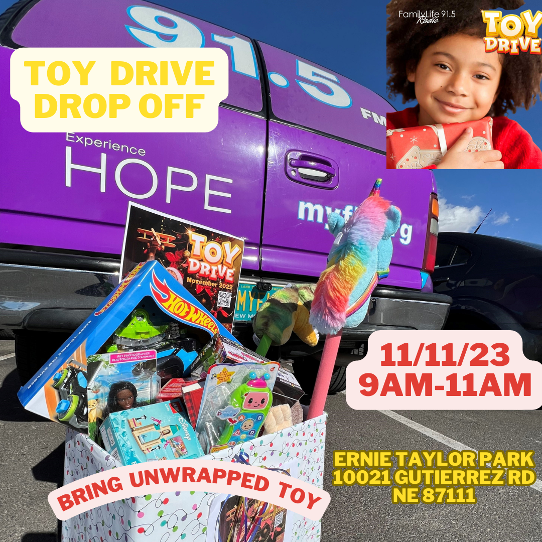This year’s toy drive has begun and we want to give the kids in the International District to have Christmas they’ll never forget. Join Family Life Radio 91.5 FM, Saturday, November 11th from 9:00 AM to 11:00 AM for “Toy Drive Drop Off” at Ernie Taylor Park 10021 Gutierrez Rd NE, ABQ 87111