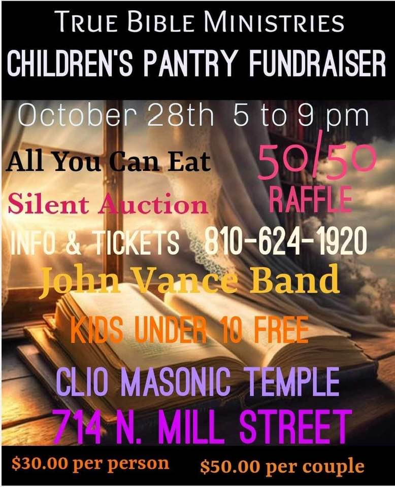 We are opening a baby pantry in Clio, MI starting September 1, 2023. This event is to raise funds for this cause. There will 50/50 drawings, silent auction, and Music with JVB, John Vance Band. Great music and Dancing