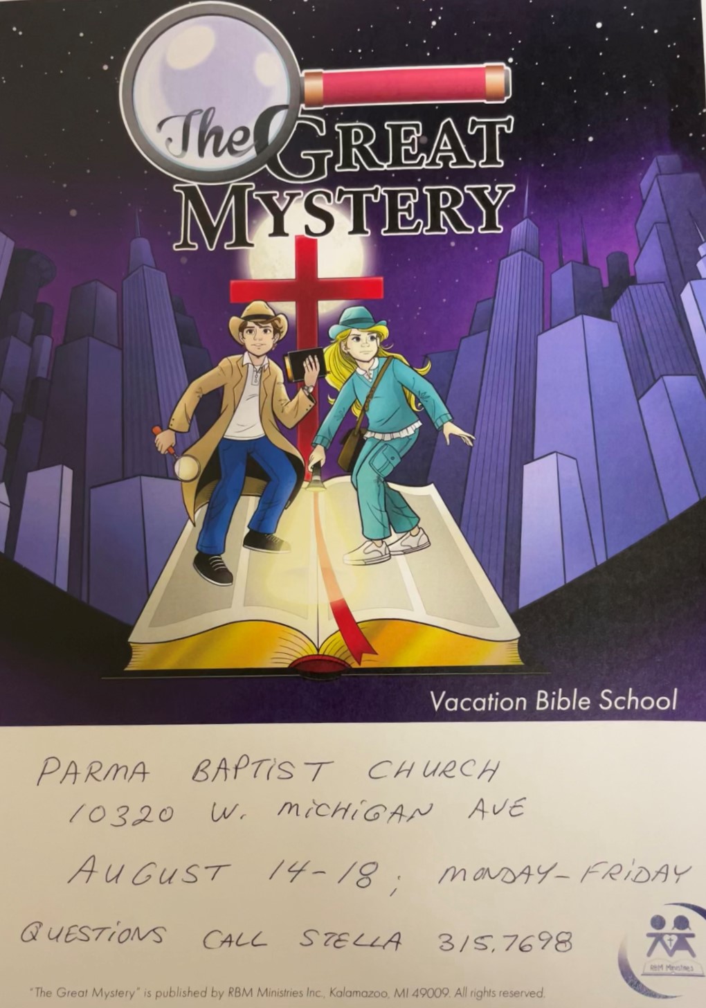Vacation Bible School “The Great Mystery” hosted by RBM Ministries. Monday August 14 through Friday August 18, from 6pm to 8pm at Parma Baptist Church located at 10320 W. Michigan Avenue, Parma, Michigan 49269.