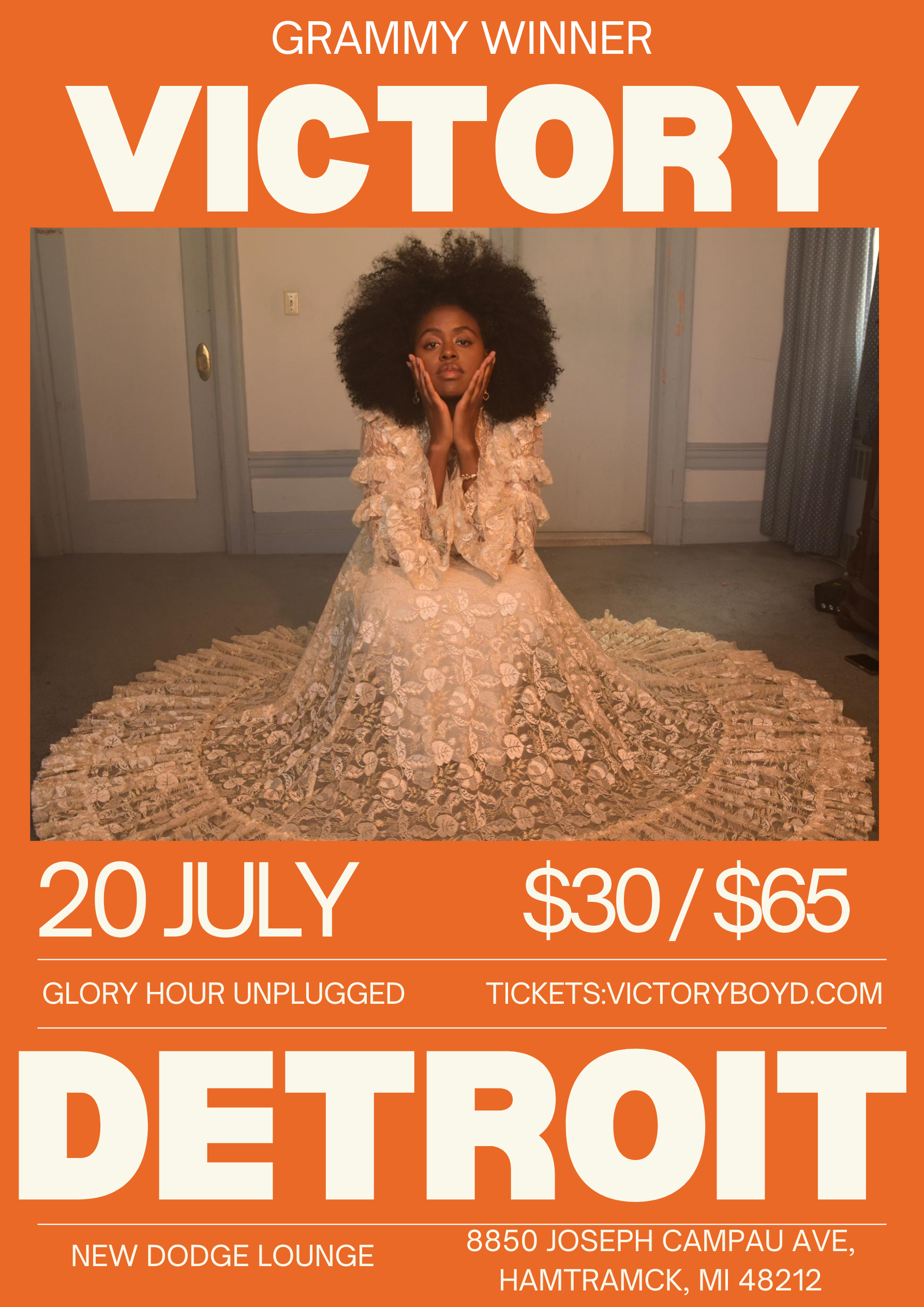 Victory Boyd performs her Gospel album Glory Hour in Detroit, Michigan. Hosted by New Dodge Lounge, this is an intimate acoustic presentation curated by Victory to set an atmosphere that invites the Glory of GOD to be made manifest. Join us on July 19th, 2025 to experience Glory Hour Unplugged.