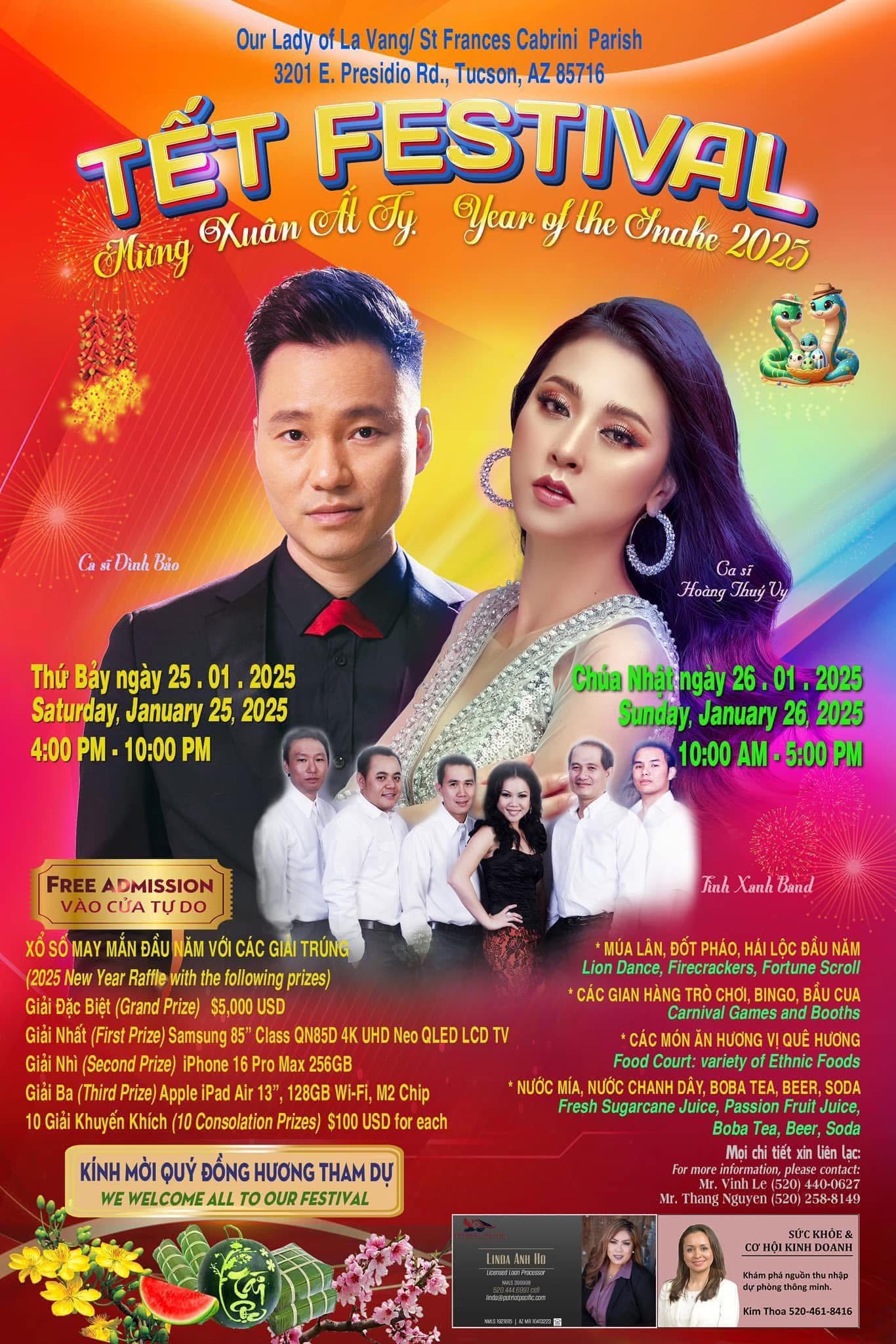 Our Lady of La Vang/Saint Frances Cabrini Parish is celebrating the Lunar New Year, January 25 from 4-10 pm and January 26 from 10 am to 5 pm. Admission is free! Fun for the entire family with carnival games and booths. Lottery tickets for sale with grand prize of $5000. Vietnamese food will be sold. Enjoy our delicious freshly grilled meat sticks. Freshly squeezed sugarcane juice will be available.