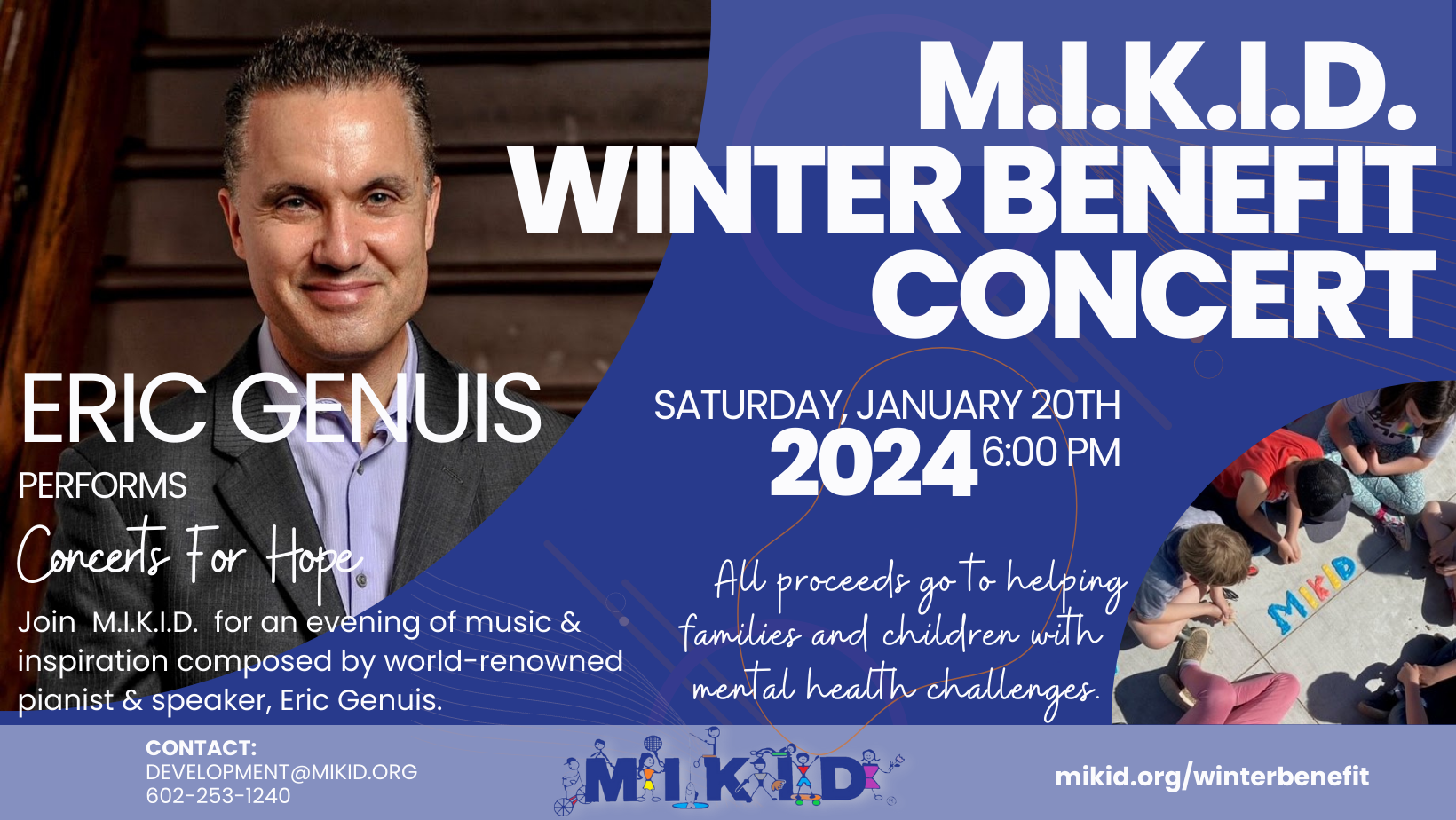 This is M.I.K.I.D.’s Second Annual Winter Benefit Concert. All proceeds from this event go directly to helping families and children with mental health challenges. Nonprofit fundraising efforts are vital to the missions that they serve. The funds raised through this event will help provide resources for M.I.K.I.D.’s programs, services, and outreach to better serve our communities.