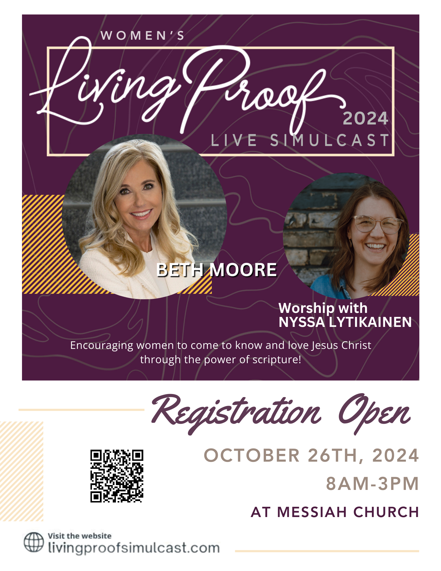 Join us on October 26 for a transformative day of teaching as women from around our community – and around the nation! – open the Scriptures together and learn from renowned Bible teacher, Beth Moore. There will also be live worship led by Nyssa Lytikainen.