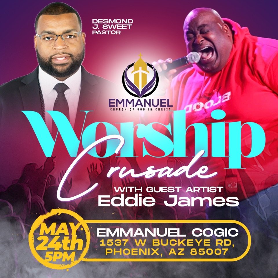 Come experience an unforgettable evening of praise and worship with Gospel recording artist and Son of Emmanuel, Eddie James. Let your spirit be refueled and uplifted through powerful music and heartfelt ministry.