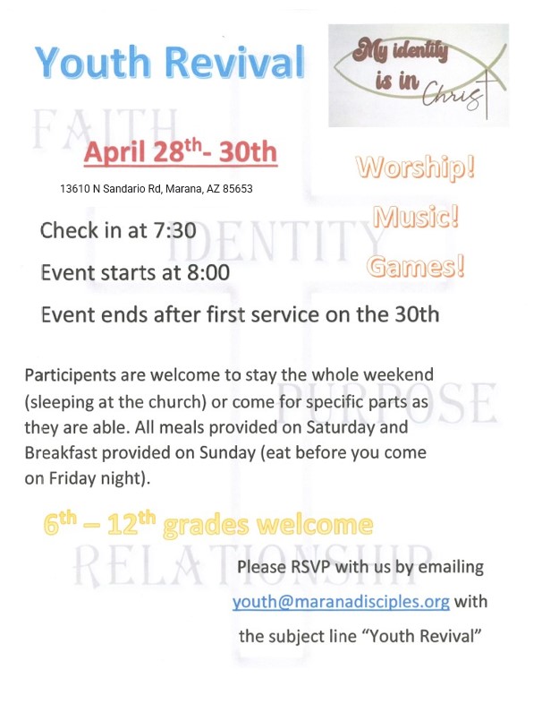My Identity is In Christ, a FREE Youth Revival Event geared towards grades 6-12, however, all are welcome! They’ll be Worship sessions, powerful ministry, games, food, and tons of fun!
