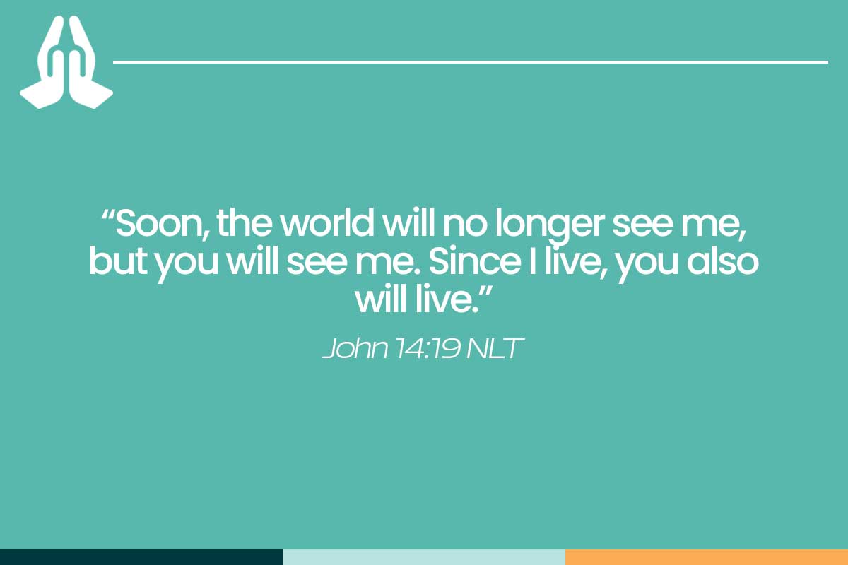 “Soon, the world will no longer see me, but you will see me. Since I live, you also will live.”